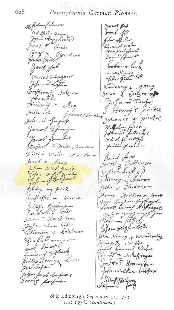 Arrived in PA with two other Jacobi/Jacoby males named Michael and Peter on Ship Edinburgh at Philadelphia PA in 1753.