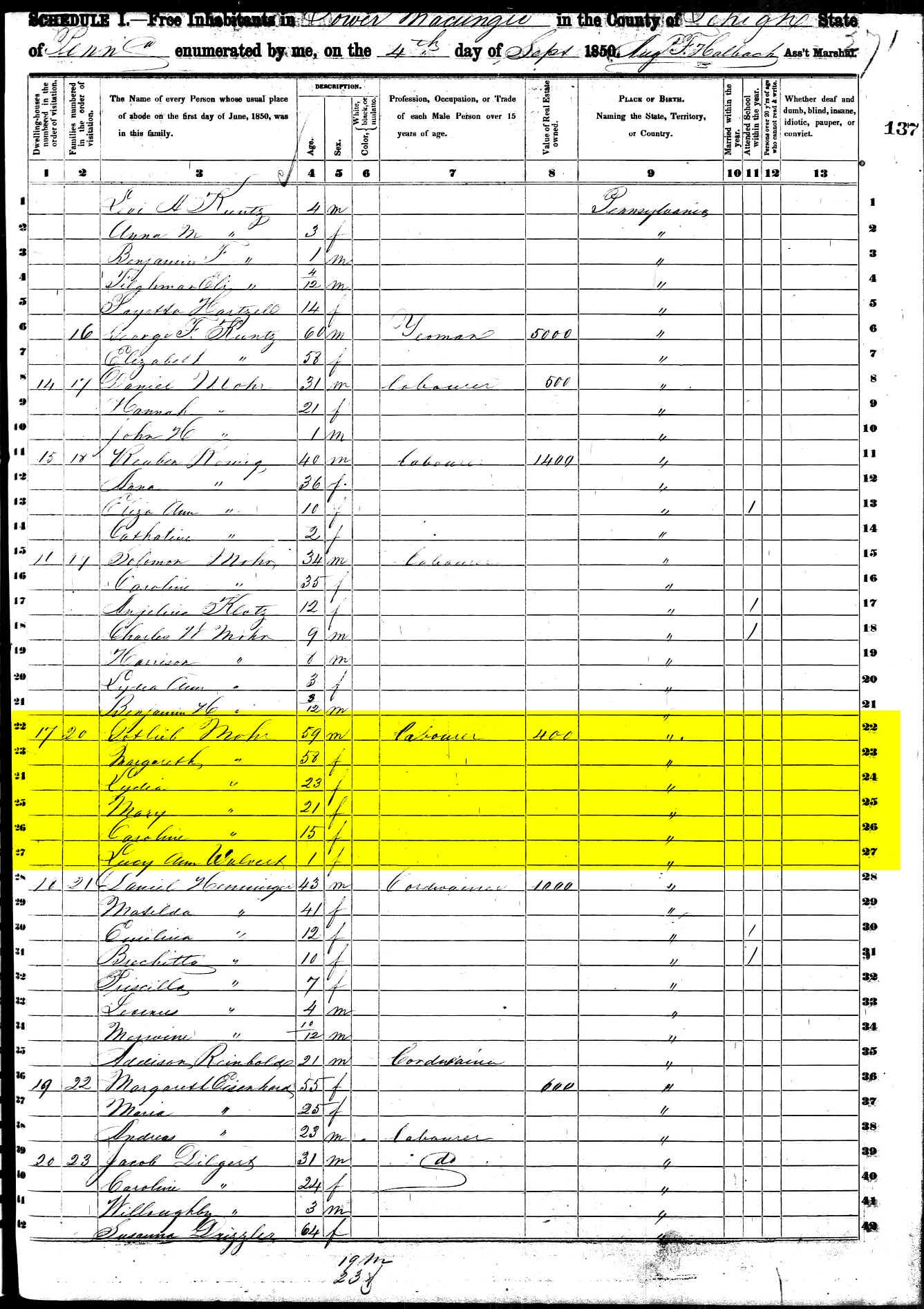 1850; L Macungie Twsp; Lehigh Co Pa; p.111; Gottlieb Mohr; age 59; laborer; his wife Magaretha, 58; Lydia, 23; Mary, 21;